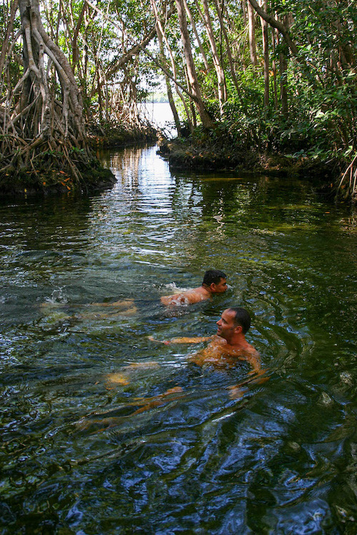 Celestun (Yucatan State). We road tripped from Tulum to Merida, on to Celestun to see the flamingos and mangroves on a boat trip which was great fun; the water was red, like boating though red wine. Dave swam in the mangroves, I watched from the boat.