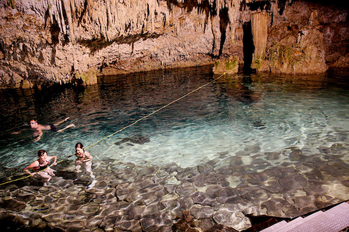 We went swimming and snorkelling in cenotes. There are loads of them around the Yucutan…naturally formed sink holes many of which connect to a 100 mile long under ground river in this area. We visited 2 separate cenotes near Coba; mind blowing! All you see from the surface for these 2 is a small entrance hole and a very steep ladder down. This opens out in to an underground cavern filled with fresh water. Some small fish swim around you in the deeper of the cenotes. The first one was full of stalagmites and more rocky and shallow in parts, the second was a much larger pool of clear blue fresh water which was much deeper. The third cenote was on the Tulum road called Grande Cenote. This was much more open when you entered and had trees and plants growing in it and much more fish. However if you swam under some of the rocks in to caves there were huge drops underneath you as the caverns open out to much deeper water. Lots of divers go to the Grande Cenote but you have to have a specialised cave diving certificate. It’s scary snorkelling in the darker parts of it as you don’t know what’s under you and I was convinced there was a bloody huge giant squid living down there.