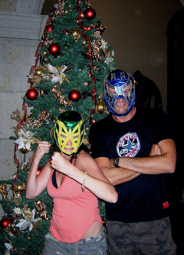 Merry Christmas from Guadalajara from the hotel lobby without our suitcases which weren’t loaded on to the same flight but we are assured will show up later. The online Mexican wrestling name generator gave us our Luche Libre wrestling names. Love from Bam Bam Fantastico (Leza) and Vaquero Toxico (Dave). Couldn’t be any more appropriate. Love the comments!