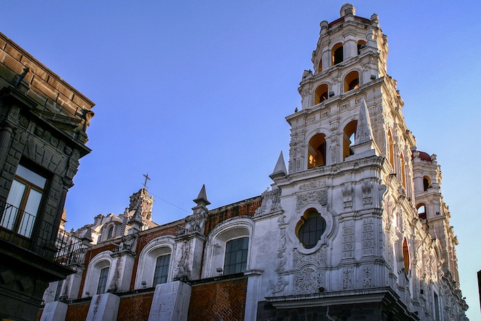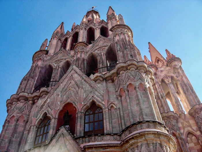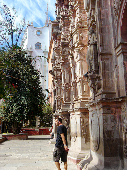 Baroque and Neo-classical architecture of The Church of Our Lady of Guanajuato and gorgeous ornately carved pink stone of the Jesuit Templo de la Compania.