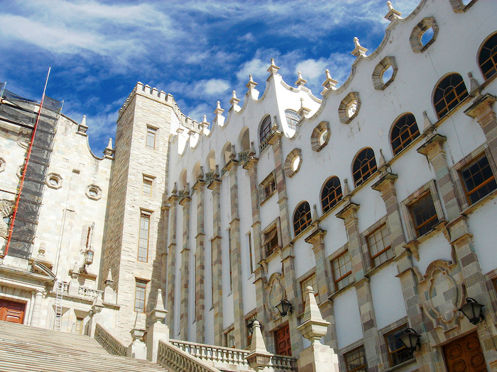 Long wide steps up to Guanajuato University located in the historic centre of the city; home to over 33,000 students resplendent in white and stone.