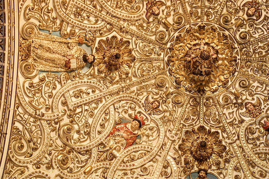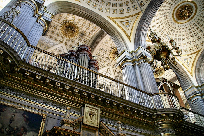 The Basilica Cathedral of Puebla is magnificent…a UNESCO World Heritage site consecrated in 1649 and founded by Philip II of Spain. Herrerian-style (Spanish/late 16th century), a dome soared 43 metres above us surrounded by the major prophets and archangels. The processional nave flanked by stations of the cross led us through columns, gold, paintings, statutory. It’s a fantasy of a building…a show off of wealth and power.