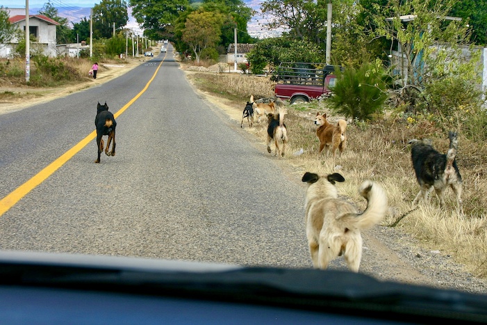 Long drive but it’s been amazing; absolutely breath taking mountain scenery; winding high up…winding all the way back down with some pretty huge drops to the side. I’ve been distracting myself with map reading using my thumb to measure distances for scale…yes it’s worked….hah! Dave drove carefully and didn’t act like he was Steve McQueen in Le Mans. There are LOTS of dogs in Mexico…loads of them running around and unfortunately a lot of squashed dogs on the roads. They often sit in the middle of the road, wander idly alongside it or sleep right on the edge of it. This gang in the photo ran straight out in front of us from nowhere.