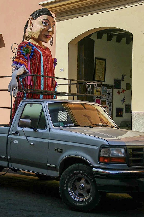 The crafts are famous in Oaxaca, it’s one of the artisan capitals of Mexico. Stencilled street art, lots of skeletons and skulls, huge papier mache effigies which are used in street carnivals and fiestas. Day of the Dead is celebrated on 1, 2 and 3 November each year and they believe that their dead ancestors come back to visit them on these dates; they hold fiestas and decorate the cemeteries, the headstones of their loved ones, parade through the streets with papier mache effigies.