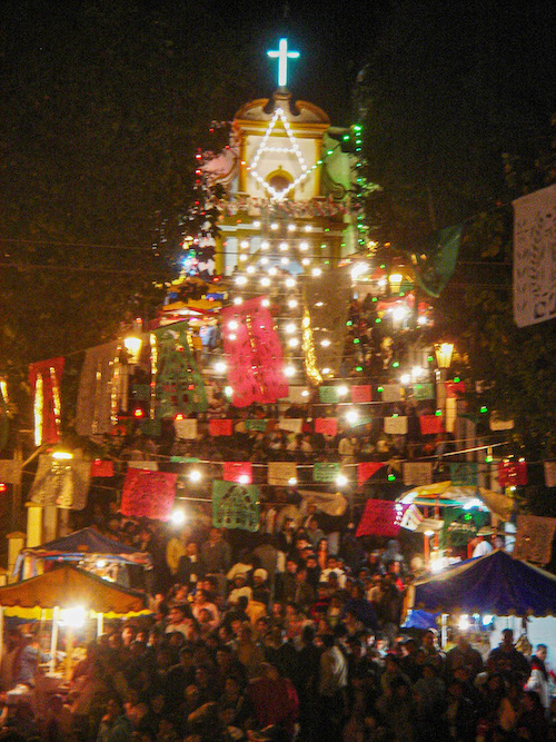 San Cristobal de las Casas We arrived in the city at 6pm, we’d been wary of driving after sunset on unknown roads and had been warned it wasn’t a good idea as there’s no road lighting so we were a little nervous; we were relieved pulling in to town… dark and very cold. We quickly found a hotel to stay at for 2 nights; £17 a night a double room…bargain apart from the very lumpy pillows. The 4 of us headed out to explore the city to find that it was in full swing for the Guadalupe festival which San Cristobal appears to be one of the main gathering points for; one of the main churches of the Guadalupe is based here. It was a great introduction as the city was in full on festival mood, loud rockets being fired in to the sky, streets hung with flags and crowded with food stalls and street vendors, a big wheel which none of us fancied our chances on…too wobbly. The atmosphere was amazing. The streets were crowded with people; city dwellers and people who’d travelled from their homes in the mountains. The church of Guadalupe is based at the top of a hill reached by a long street which culminates in a set of steep steps. It was lit up and the steps were packed with people carrying flowers to decorate the inside of the church. Our timing of arrival was perfect; we never expected to witness a major Mexican festival and it has left us with amazing memories.
