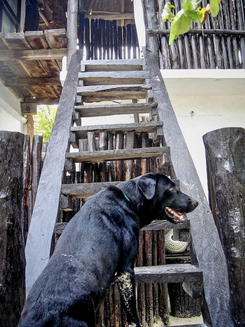 The owner of the hotel…10 freestanding cabanas on the beach – is Mexican, called Roberto, who has lived all over the world and previously ran a hotel in the Maldives. Anyway this place is fab, basic as in no electric light at night in our room and sporadic wi-fi access – but luxurious in his attention to detail and how gorgeous it all looks….everything’s orange, dark wood and white. The other 9 cabanas stand on floor level on the beach – ours is the only one on stilts. The main ‘box’ is our room with huge bed with mosquito net etc, all glass and wood frame walls and black bamboo floor and white muslin sheets over the glass for privacy. The sun wakes us every morning at around 6am but we fall asleep around 9pm every night anyway as we do nothing all day. We can watch the ocean crashing on to the beach from the bed and our bathroom is a step down to another open area on stilts with loo, shower etc. it’s kind of indoor/outdoor – it doesn’t have a door and it’s walls are bamboo poles but as we are up on stilts it’s private – though I guess if Dave did a big fart everyone would be able to hear him. I think we are the only people staying here at the moment as the rest of the guests seemed to have left yesterday and this morning. Anyway – hardly any of you will bloody read this so I will just stick some photos up! Enzo the resident dog trying to get up to our room; and a few pictures of where we are staying…we are not far from Tulum Ruins.