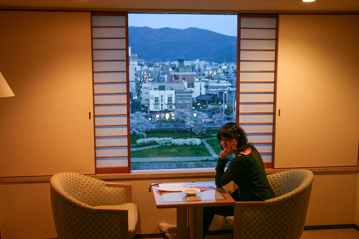 Relaxing back at the Fujia hotel feeling a little ‘templed out’ but with a fabulous view from our room across the Kamo River.