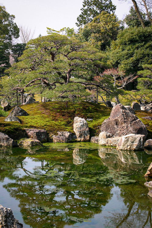 Built in 1679 Nijo Castle is gorgeous with captivating gardens, sweeping roof tiles, latticed wood, gold details, intricate carving. The ornate main gate leads to a 68 acre site including the Ninomaru Palace and the ruins of the Honmaru Palace. A gardener is clipping pruning and shaping a tree. The artfully designed landscaping is extraordinary, the most beautiful we’ve seen.