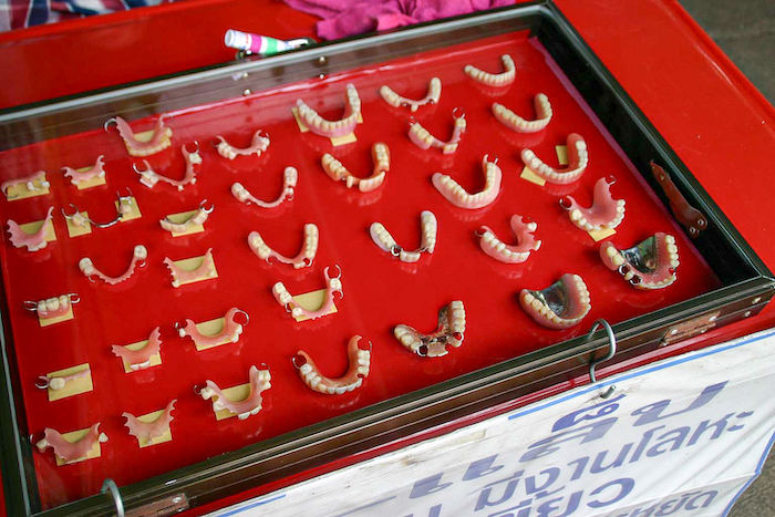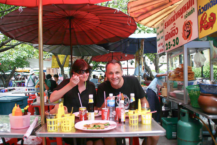 Another cab ride…now we’re wise to it each trip costs around £1; it’s too hot attempting to walk everywhere. To a local outdoor market for something to eat before wandering in to the Amulet market where monks, cab drivers and people in dangerous professions come to buy amulets and lucky charms. You see these hanging around necks and rear view taxi cab mirrors all over Bangkok. I reckon the tuk-tuks, cab drivers and so-called tourist police must have the most dangerous professions. They surely hold the highest quotient of people wanting to punch them out of frustration. We’re not tempted by the man hoping to sell us a pair of used false teeth.