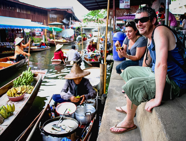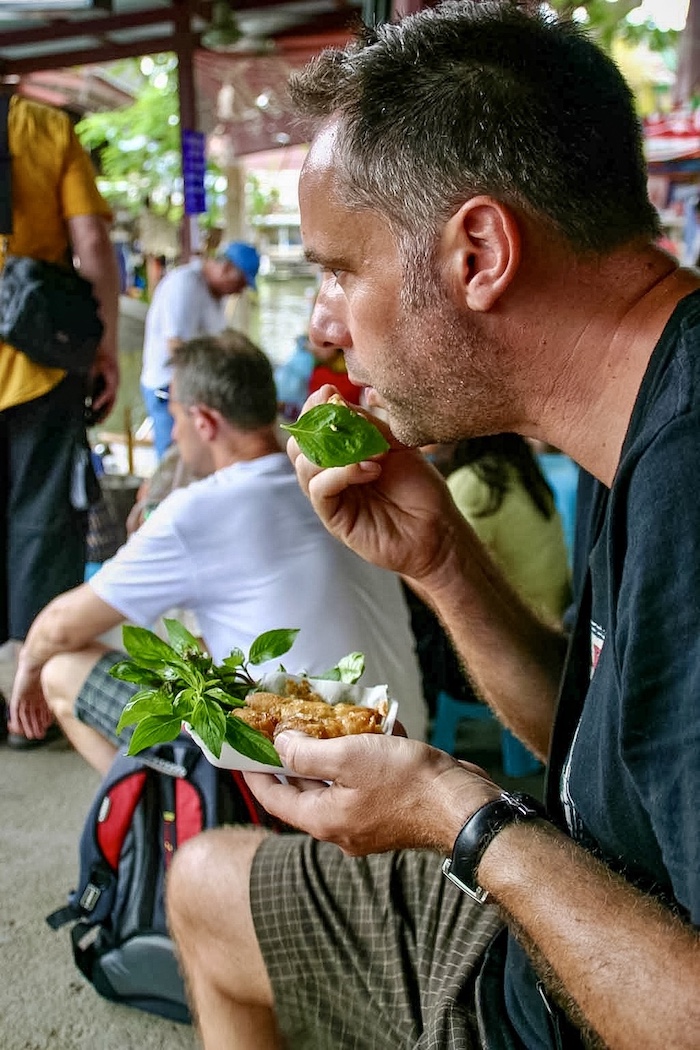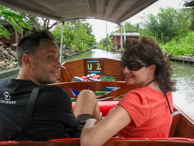 Yesterday Dave, Georgie, Michael and I booked the hotel’s mini-bus and travelled 104 kilometres south of Bangkok to the floating markets at Damnoen Saduak, between Nakhon Pathom and Samut Songkhram. Travelling through the canal system by boat through a market which isn’t all floating…rather you float through on your boat asking the boat driver to stop if you want to look at anything. In some cases a wily shopkeeper will reach out with a long handled crook, catch your boat and pull you in to dock at her shop. There’s a lot of tourist tat for sale but the food section was fabulous; fresh fruit and vegetables, people cooking traditional food on their boats which we pulled up alongside to buy from or jumped off to sit on the quay to buy and eat from boats pulling in to us.