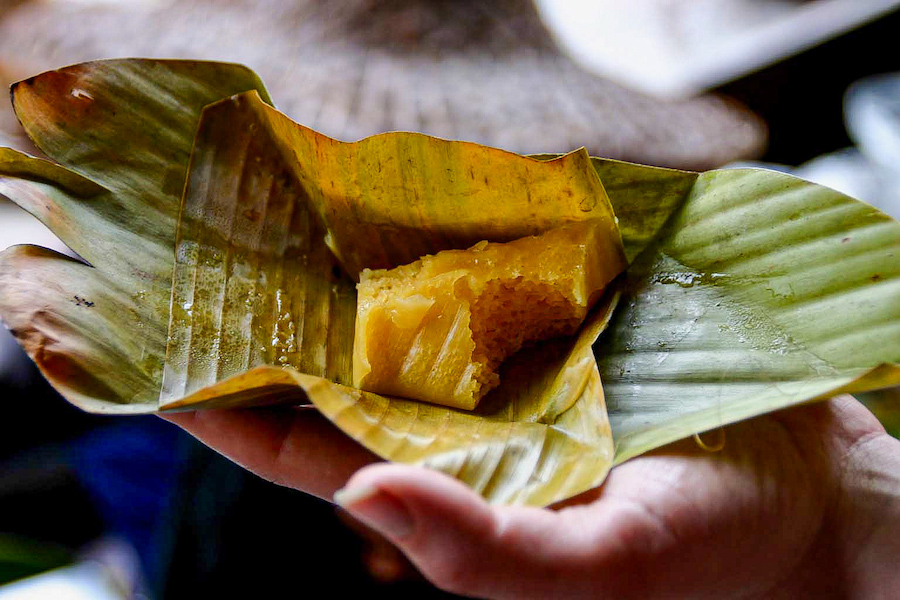 Fresh spring rolls cooked to order on a boat and delicious small dumpling like pancakes filled with greens. Traditional hats protected most of the vendors (mainly female) from the sun. An elderly lady with a wonderful smile reached up to serve us a spongy cake-like bread wrapped in banana leaf…adding extra flavour as well as doubling as a plate.