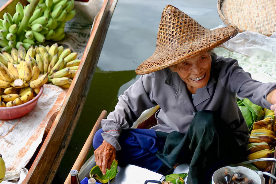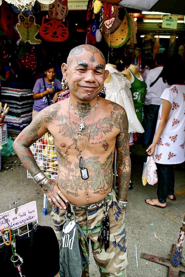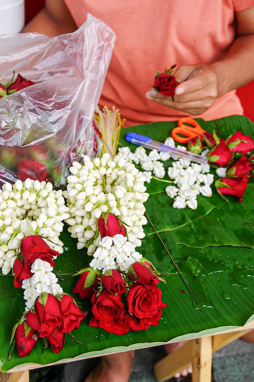 Around the city images of the King are everywhere. At a local market we meet a heavily tattooed man with dragon flames for eyebrows who is more than happy to pose for me, street performers in elaborately detailed costumes are playful and engaging and there’s more stalls creating and selling flower offerings for the temples.