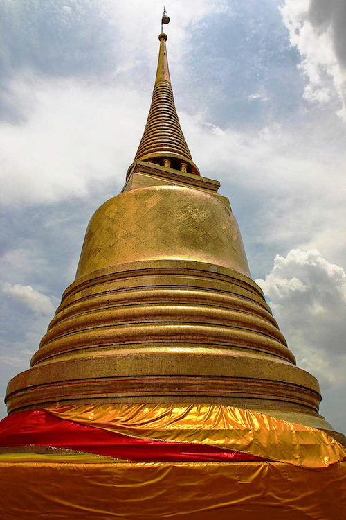 A short cab drive away we jumped out on a bridge to seek Wat Saket and The Golden Mount. Built on a former collapsed chedi (due to soft soil) during King Rama III’s reign…it’s situated on top of the man-made hill created from the collapse of rubble. We asked directions of a local man…what fools…”Sorry that’s not open until later this afternoon…you can’t go there now as the monks are chanting, but here let me show you lots of other things on your map.” (things we’ve never found evidence of; the black Buddha and the lucky Buddha). It takes a minute or two to twig on because he really is deviously convincing. But…because his salesman patter exactly resembled that of a man we talked to on Monday we cottoned on to the potential scam and found the Golden Mount ourselves…a 5 minute walk around the corner…open as we expected.