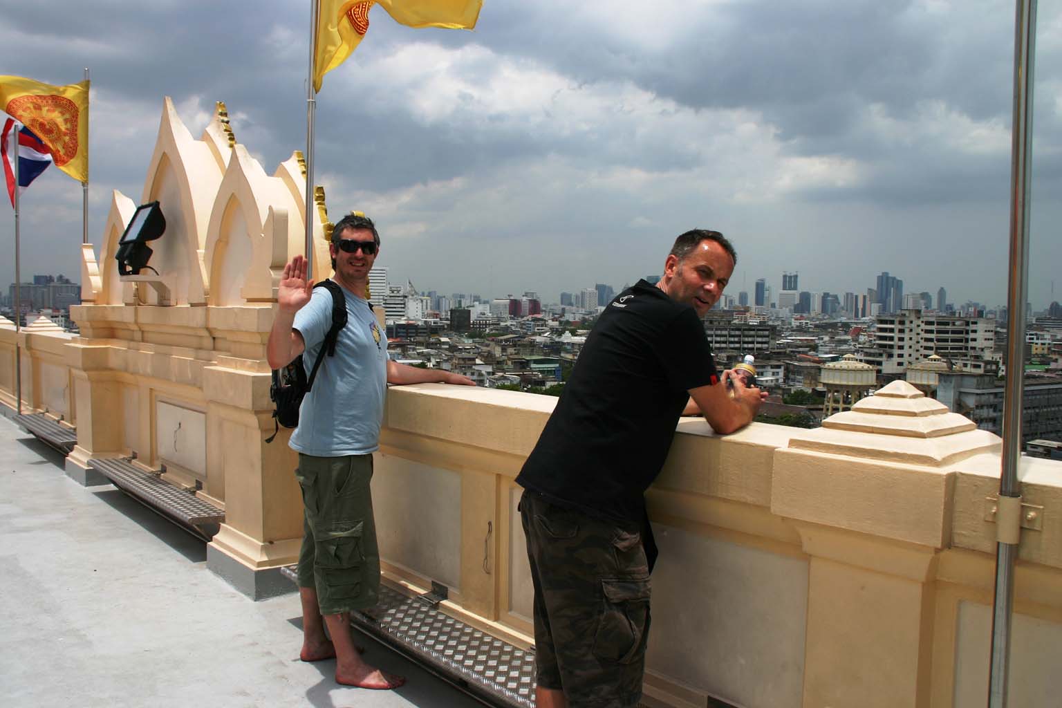 We climbed around 400 steps to the summit where shoes have to be removed as is custom before entering most monuments…then hopped and limped across a blistering enducing scorching hot rooftop. Sheltering our feet under benches in small patches of shade when we wanted to stop, we looked out across views of the city whilst standing at the foot of the impressive sparkling golden mount. Between the reigns of Rama I and Rama V, Wat Saket was used for cremations as it stood outside the city walls. In the 1800s cholera outbreaks resulted in thousands of bodies being brought to the site, the number overwhelming the ability for all to be cremated…resulting in many being left out for the vultures to devour…something I believe is still practiced in India by the Zoroastrians. I have no issue with this method of corpse removal…environmentally it must be cleaner than most alternative options.