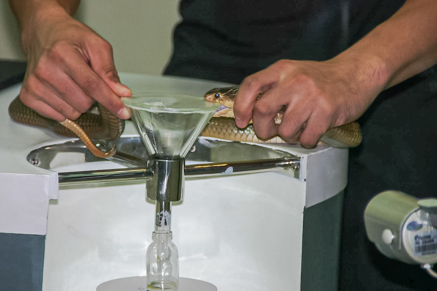 Day 4 in Bangkok (May 21) we had a run around town with Michael, an Australian guy staying at our hotel whose girlfriend Georgie was arriving later that afternoon. I cobbled together an itinerary and our first stop was a snake farm based at the Queen Saovabha Memorial Institute in the Silom/Lumphini area. Originally built in 1923 the snake farm was only the second of its kind in the world (the first was in Brazil). Apparently there are 60 different poisonous snakes in Thailand and this institute which is also a hospital, prepares anti-venom for snake bite victims. We went to see a venom milking at 11am; one of the handlers struggled to placate an agitated cobra before he could milk it by holding it behind the head and pressing its fangs into a plastic sealed jar. It’s pretty freaky how much venom comes out…we had no idea.