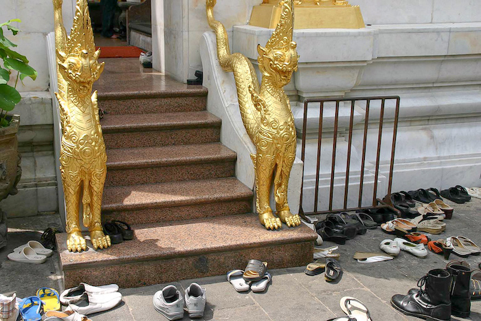 At Wat Bowon Niwet waterlily flowers were being prepared as offerings to the temple buddha. A golden chedi at the Wat’s shrine holds ashes and relics of Thai royals. I photograph footwear left outside the temple steps, a familiar sight across this part of the world.