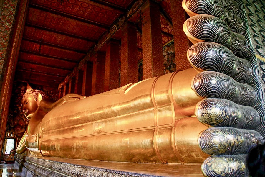 The huge buddha with wonderful whorls on his toes has a brick core shaped with plaster and gilded. It represents the entry of Buddha into Nirvana and the end of all reincarnations. The soles of the feet are 3 metres high inlaid with mother of pearl. We walk around it…dazzled, one of the largest statues of Buddha in Thailand, it’s magnificent.