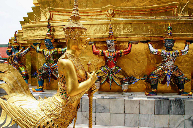 We’ve been temple hopping again…first to Wat Phro Kaew (The Temple of the Emerald Buddha) where we watch a buddha statue being layered with gold leaf…each person applying a small square leaf of gold to bring luck. Building of this large complex began in 1783 during the time of Rama I. We’re told it’s the most sacred buddhist temple in Thailand, the nation’s foremost place of worship where annual state and royal ceremonies are held presided over by the King. Mythical figures made from bronze and gilded with gold leaf are half-animal half-human celestial beings which were said to have lived in the the mythical Himavanta forest. Twelve 16 foot tall statues of Yaksha (giants) from the Ramakien epic (a Thai version of the ancient Indian epic Ramayana of good triumphing over evil) hold a mace or gada and guard the temple gates.