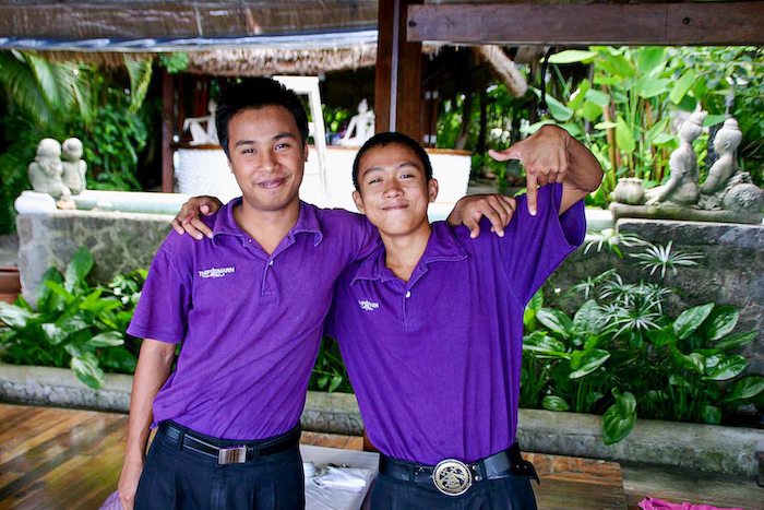 Chai was our waiter at breakfast every morning at Thipwimarn. 17 years old he used to live on Koh Phangan…but he kept going to the infamous full moon parties so his mum moved him to Koh Tao! He’s a big Chelsea football fan, kept telling us his haircut is just like that of Chelsea player ‘Choko’. Lost in translation we were scratching our heads…ahhhh…Joe Cole. Peter is Burmese, 22 years old and the other waiter we talked to the most. A year ago he left his family behind in Burma to work in Thailand so he could send enough money back for his two younger brothers to go to university. We have a lot of respect for what he’s doing…the two of them make our stay here a lot of fun.