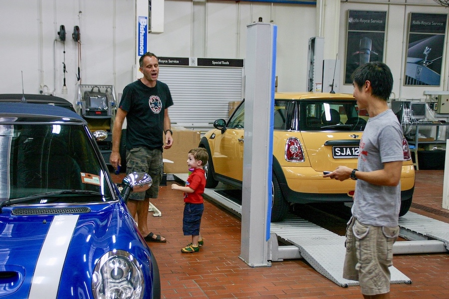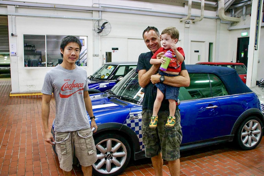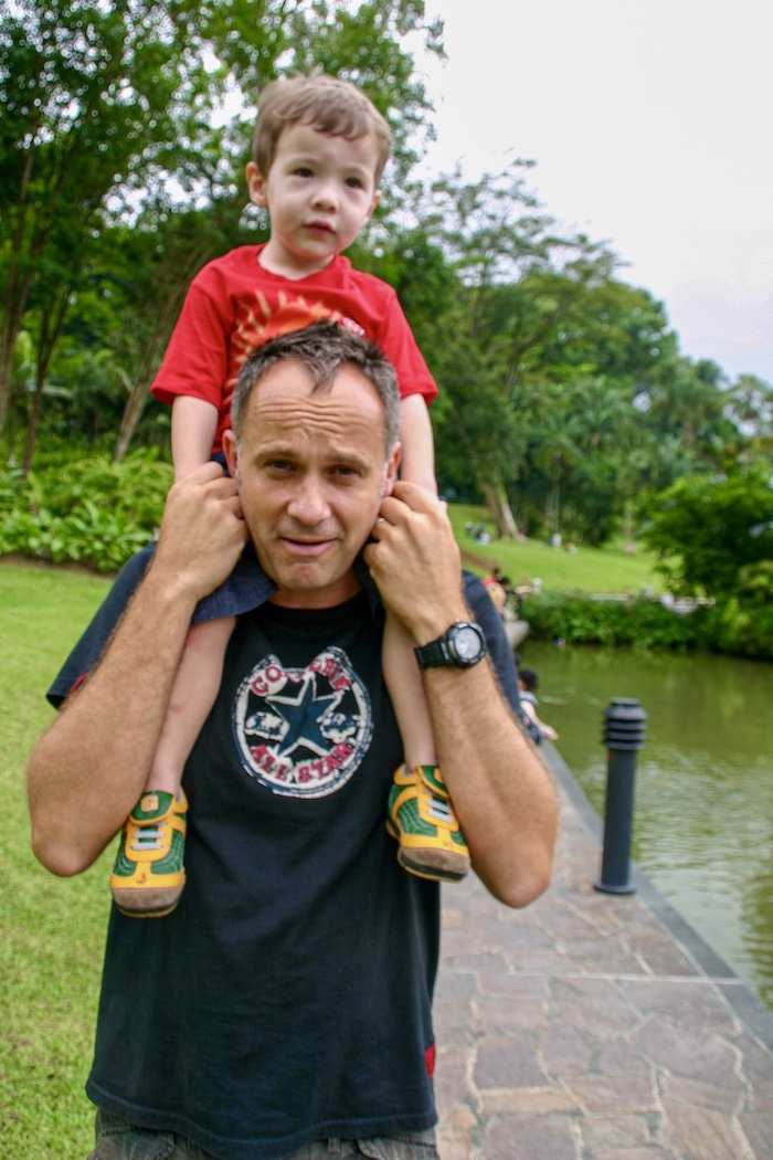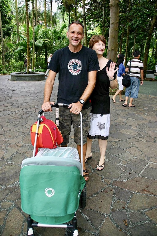I didn’t take any photographs of us at the small restaurant local to Hil and Mark’s place where we ate the best crab dishes I think I’ve ever tasted. I loved it so much I asked the waiter if I could keep my plastic chopsticks as a memory to which he kindly obliged after looking at me oddly. Dave and I had a wander around the city, along the harbourside and in to some of the huge upscale shopping malls full of designer goods. It’s a very strict country with a lot of rules; everywhere is exceptionally clean, chewing gum is banned so the pavements are immaculate. There’s no sign of graffiti or street fashion or teenagers showing off and yelling to one another. It’s a little too perfect, hermetically so…we feel cut off, stifled from the excitement of the countries we recently travelled through. People here seem to keep to themselves, it’s hard to start a random conversation with strangers. The food however is pretty amazing everywhere we eat. We visited Mark’s workplace at the Mini automobile showrooms where he’s the Sales Manager and had a wander with the family around Singapore’s Botanic Gardens.