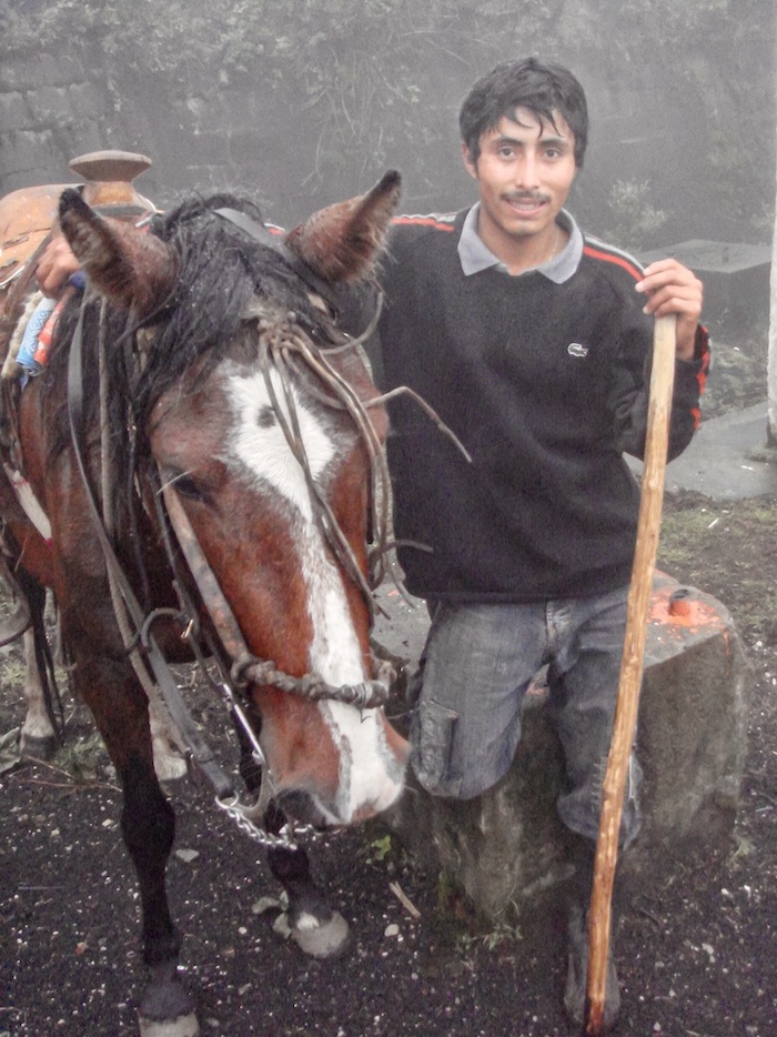 Dave, Hadley, Julia and Christopher decided to take the 90 minute trek straight up on foot. At least we were wearing raincapes and had bought food, water and torches. An Australian guy was in a t-shirt and flip flops. Dave set off on foot in his long black cape and stick looking like Gandalf disappearing in to the mist. Along with some Israeli travellers and an American girl I’d opted for what I thought the easier option of covering at least 40 minutes of the trail by horse; with Guatemalan saddle and blankets and a guide called Ronald leading the way on foot, graciously carrying my stick. Only 10 minutes in on a narrow trail, my horse stumbling a switchback of loose mud and stones, scraping by trees and barbed wire fences, I realised that hiking might have been less unnerving, some of the group looked rigid with fear. I was inexplicably confident in my riding skills despite not sitting on a horse since age 14…no riding hat or even clear visibility. Going up was marginally easier (I say that loosely), as I could negotiate the steep trail by leaning forward. At points where the trail ran at a ridiculously steep angle, the horse picking over tree roots and rocks, I had to lean back. It was however exhilarating and I imagined myself as a cowboy; a fat cigar and poncho riding in to a Magnificent 7 fantasy (more like the Mortified 7). Ronald pulled us on regardless of legs scraping trees and whether we were capable of remaining saddle-bound. A relentless scrappy dog ran ahead and back, nipping to hurry the horses on. Eventually we met with the walking group knackered from their climb and soggy. I dismounted unhooking my feet from the stirrups, took up my stick and asked my sure footed steed and Ronald to wait for me in pouring rain for the ride back down.