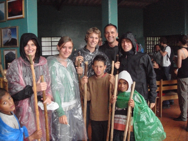 Leaning flat along the horse’s back on the steepest downward sections, avoiding trees and grazed legs we squeezed through narrow gaps. Ronald encouraged the horse, I concentrated hard to stay on it. At times my feet were forced out of the stirrups as we scraped around a tree, I pulled on the reins calling “Uno momento” to put my feet back in, nudging the horse forward. In a dense thicket of trees it dawned on me that the other rider, a young Israeli girl following behind, had gone very quiet…she’d slid straight over her horse’s neck. Ronald went back to help. We realised then we’d strayed off the trail as Ronald muttered Spanish obscenities and I saw my light randomly bouncing around. I felt strangely calm, complete confidence in Ronald…he did this trek regularly and though he hadn’t come best equipped, he was wearing a sturdy pair of wellies. Some minutes later after asking me where I came from and why I didn’t have babies (was this a test to see if I deserved to be taken back?) we were back on the trail and eventually saw the lights of the mountain town where we’d first gathered. We got back 10 minutes before the walkers. I felt quite smug in my yellow cape as I watched them straggle in drenched, covered in mud. The kids pounced on us for our sticks, raincapes, torches, anything and we all fumbled foolishly checking our pockets were zipped closed. I gave my stick to a boy, failing to find the girl I’d bought it from knowing they’d be re-sold. The kids have found a niche market in stick-hire…and we couldn’t have completed the trail without them. We made good progress back to Antigua despite heavy rain and low visibility, I don’t know how the driver could see but after a couple of near misses we were back in our rooms leaping gratefully into hot showers. Dave and I were asleep by ten, exhausted, emboldened by the adventure and eternally grateful to Ronald and Hector for an incredible one-off experience.