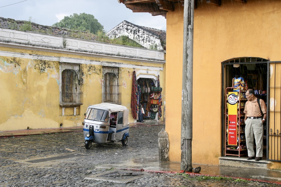 We were swarmed by kids as soon as the minibus doors slid open, selling branches smoothed to long walking sticks for 5 quetzals each. It started raining, heavily…Dave and I bought raincapes in a shop with iron security bars…a feature we’ve seen everywhere here.