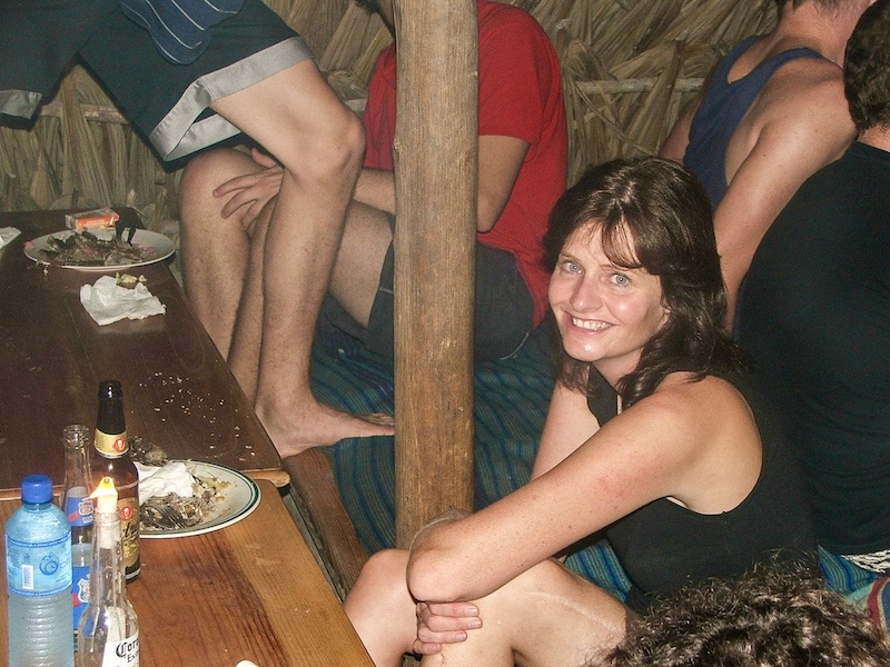 After showering we all headed to El Retiro for buffet dinner served in a huge grass-roofed barn bursting at the seams with hungry travellers. We’d forgotten our torches again, stumbled the 15 minute walk over cobblestones slick with rain and got our names on the list to eat at 45 quetzals each, just in time before they closed it. We were amazed to find it packed with 50 or 60 Israelis…calculating the exact cost of their meal. We experienced this a lot. According to Michal and Amit the Israeli travel network is very strong, with a website where they swap tips and prices. Guatemala being an easier country for them to travel, it explained why our hotel was called Rabin Itzam and the nearby local caff, Shalom. Downstairs was packed so we got the candlelit loft accessed by a vertical wooden ladder which the owner’s dog was able to run up and down more deftly than us. Striped Guatemalan mattresses and beanbags were spread around low tables. We drank beer…settled in for an evening of good food and great company, joined by Nat from Israel and Brown from Carolina. A bell rang announcing the food and lining up to check off our names we took heavy plates and loaded them with food from earthenware bowls. It’s an impressive set up, well run…vegetarian Italian pasta was excellent. We donated our second serving to an Israeli couple on the same bus earlier, too late to get on the list. In our room we crashed out to the voices of two Australians trying to pull some Israeli girls sat directly under our window playing soppy music on an iPod. Thank god for earplugs.