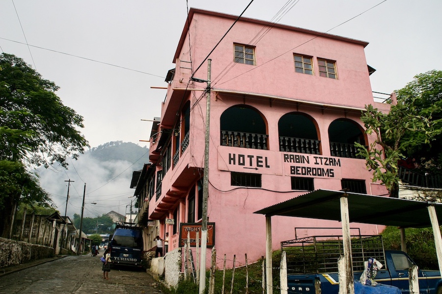 Arriving in St Elena over the bridge we swapped to a small ‘collectivo’ minibus which could negotiate the narrow winding streets and cobblestones of old Flores. The friendly collectivo guys drove us to find places to stay. Hadley checked in to a shared dorm in a hostel for £1.50 a night, on the same street we went for the upmarket option. £18 at Casa Amelia with a big double room, immaculate bathroom, cable TV and hot water shower with stunning views over a lake which folded around a small island.