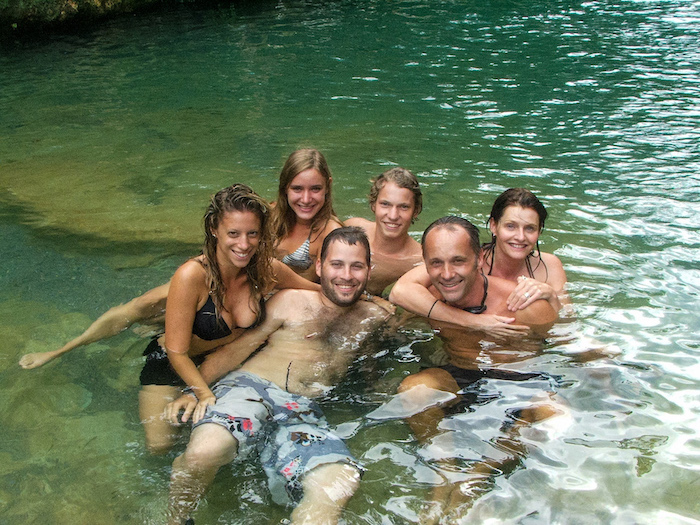The sun lowered the day cooled, some of us headed back to the cafe whilst the rest including Dave went for a last adrenaline rush…to climb down and back up a fast flowing waterfall on a dubiously attached rope ladder. Dave said it was crazy…a downward torrent of water battered him, blotting his view he could barely make out where the next rung on the ladder was. The climb down gave access to a cave of stalagmites and stalactites and to where the waterfall rushed under the limestone pools joining the river. At this point all of us were knackered and soaking wet. We snacked on local cinnamon chocolate wrapped in tinfoil sold by kids…bitter, gritty and dark, a welcome sugar rush. We had the mad 40 minute pickup drive back, showered in water as hot as we could stand to warm up, met everyone to eat at El Retiro (it was fish night); all of us exhausted but happy. Being dry was short lived…it chucked it down for the 15 minute walk back in the dark.