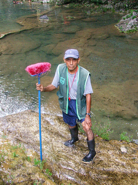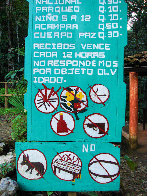 This is the man whose job it is to blow his whistle if you venture too near the edge of the falls, I admire his patience…and his pink bristled brush. The handpainted entrance sign is great…we assume it’s an image of a dog and not a giant rat. We’ve seen so many guns in Guatemala but not felt intimidated by it like in many other countries.
