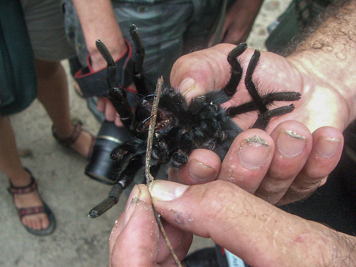 A guide found a tarantula hiding in its nest at the foot of a tree and I volunteered to hold it. Much to the amusement of everyone the tarantula squirted spider shit the length of my forearm. Flipping it over the guide showed its strong teeth, it uses venom to kill small prey (ineffective to humans) and the red hairs on its back cause an allergic reaction; all of which was explained after I’d held it.