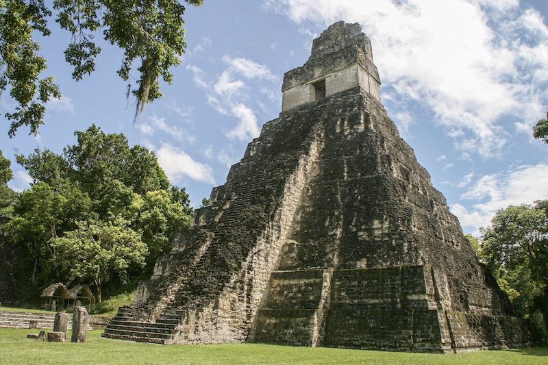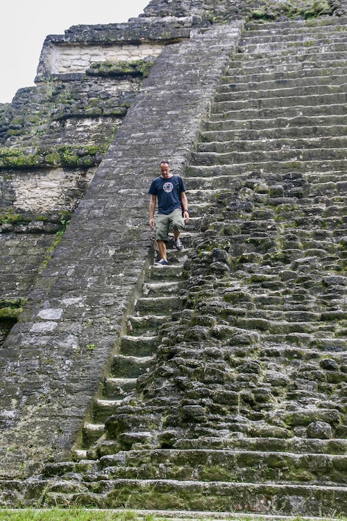 Tikal ruins. 24th Sept: We had an early night to prepare for the 3am tour bus to Tikal. Sitting on plastic chairs in an empty street we watched moths dance in the sodium lights. An old American school bus pulled up at 3.20 after collecting people enroute. Hadley dozed with his iPod earphones in, acknowledging us as we found seats and opened windows for fresh air. At Tikal park we were shepherded by our English speaking guide Lewis who sounded like he’d learned English via Louisiana. It was pitch black, stupidly we’d forgotten our torches so Hadley and Lewis lit the way and we followed, stumbling over rocks and tree roots. Howler monkeys roared to life barking ferociously from the rainforest canopy. As we rounded a bend Lewis shone his light in to the trees illuminating a towering Mayan temple. As night lifted, our group climbed steep wooden steps to the summit of the main temple, sitting above the tree canopy to watch dawn break. Thick mist moved in, parrots and toucans flitted the trees calling out. Sunrise blanketed, but magical as gaps opened to reveal three temples poking out of the tree canopy…hidden again as mist drifted back. The experience was otherworldly…the strength of the Mayan people who built these incredible structures to be closer to the sun, using astronomy to predict their future.