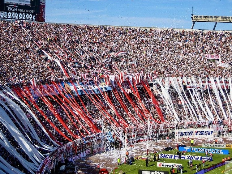 The atmosphere was electric. Fans leading up to kick off were super charged; setting off smoke bombs and waving huge flags. Super long red and white streamers unfurled through the crowds as tic-a-tape showered over the River stands. A large group of drummers entered, the noise fantastic, followed by another group twirling oversize red and white umbrellas. Firemen were on standby to hose everyone down if it got out of control. The Boca fans were contained by 12 foot high fences and barbed wire flanked by riot police and more firemen. A shame more goals weren’t scored, it would have been fun to see 60,000 River fans go bonkers.