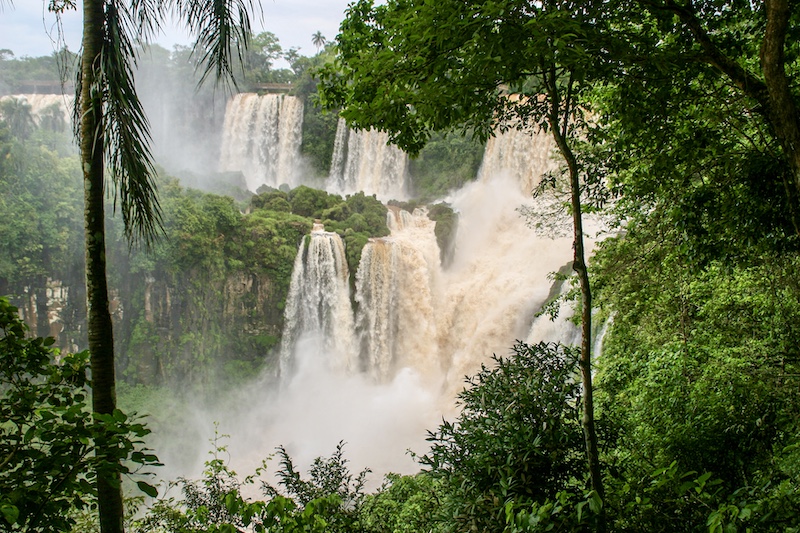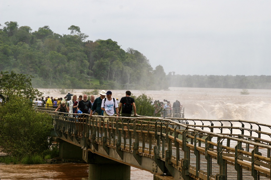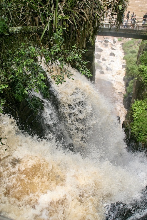 On a viewing platform right above the Devil’s Throat the sound of the surging water is deafening, everyone is soaked. Swifts weave through spray inches from the thundering flow. Heavy rains mean the falls are particularly strong and reddish brown due to the silt being stirred up. Statistics claim the water falling over Iguazu in peak flow has a surface area of 1.3 million ft² and mist rises between 100 and 500ft from the Devil’s Throat fall. The waterfall system consists of 275 falls along 1.67 miles of the Iguazu River, some of the individual falls 269 feet in height and two thirds of them are within Argentine territory. They were discovered in 1541 by Alvar Núñez Cabeza de Vaca and established in 1984 as Natural World Heritage Site by UNESCO. Legend says a big snake called Boi lived in the river. To calm its ferocity Aborigines sacrificed a woman every year but once a brave Guarani Aborigine kidnapped the woman and saved her from the traditional rite. Boi burst in anger, bent its body and split the river forming the cataracts separating the man and the woman. Another version tells that a god planned to marry a beautiful Aborigine named Naipí, who fled with her mortal lover Tarobá in a canoe. In rage the god sliced the river creating the waterfalls condemning the lovers to an eternal fall. In the Guarani language the term Iguazú means ‘great waters’.