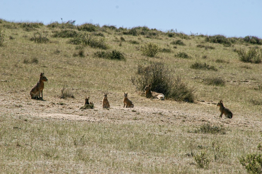 The inner peninsula is inhabited by Rheas which look like Emus; we saw several but too distant to photograph (they also have a few in the bunny park in West Ealing which amuses us), herds of Guanacos and lots of Maras (also know as the Pampas Hare). Maras are larger relatives of Guinea Pigs common to the Patagonian steppes and other areas of South America. They’re the fourth largest rodent in the world after Capybaras, Porcupines, and Beavers growing up to 18 inches in height. We saw a family of Maras guarding their burrows and young. Lizards are common, darting in and out from the cover of brush and rocks.