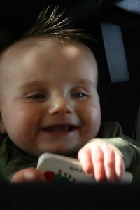 Sarah May, fresh back from her first trip to Uganada to see her Grandpa Hatch and now on his canal boat motoring the English canals. Baby world traveller already.