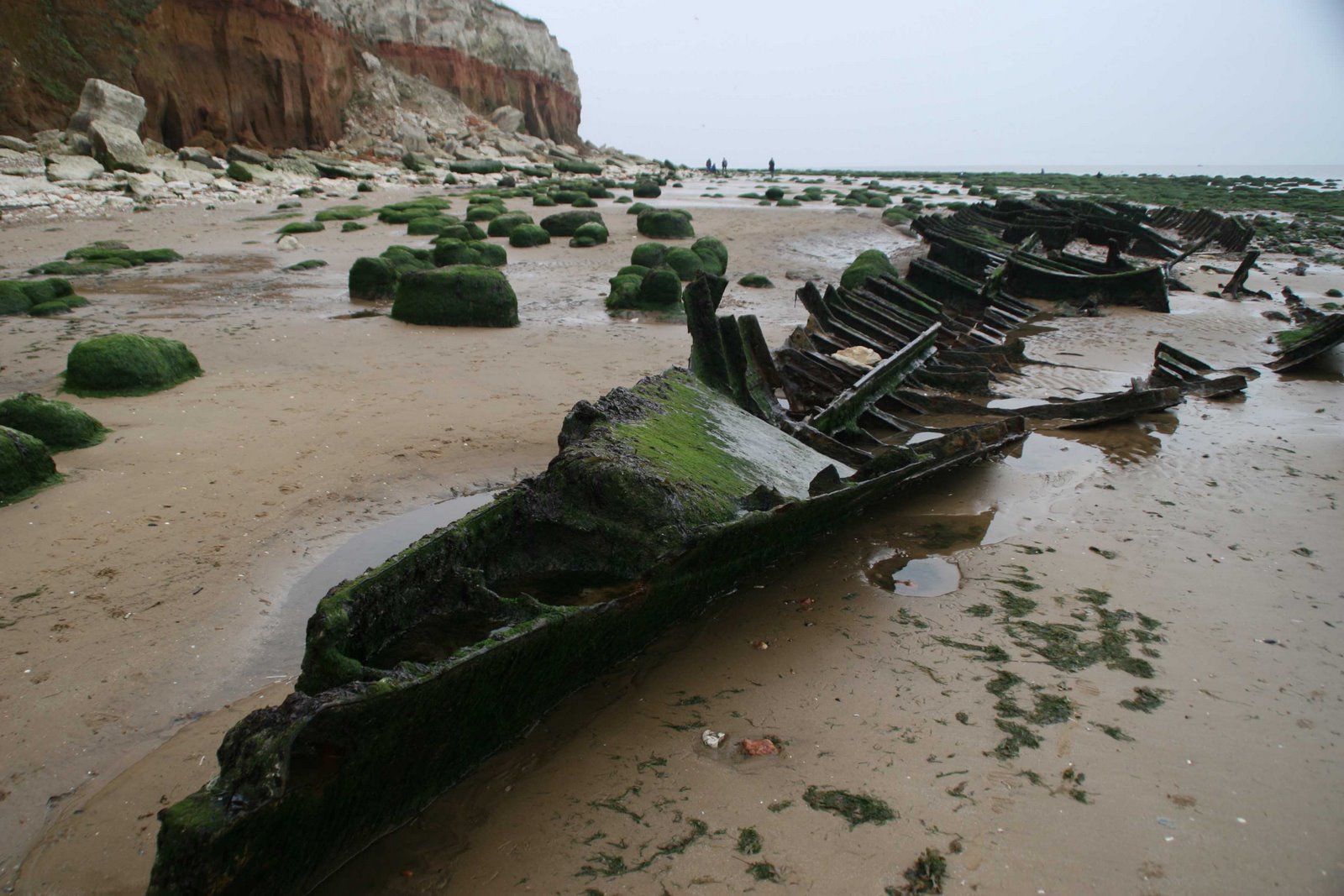 Colourful cliffs and boulders and an old boat wreck on the beach.