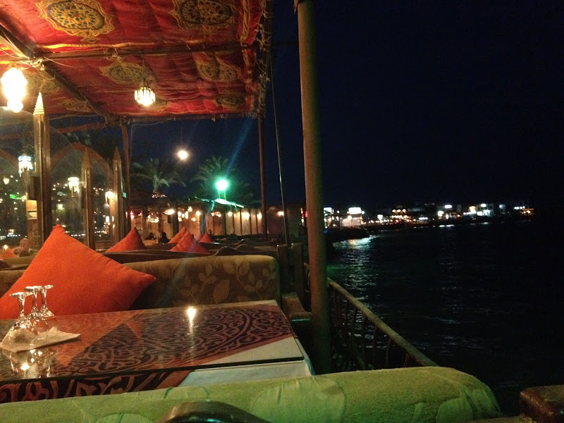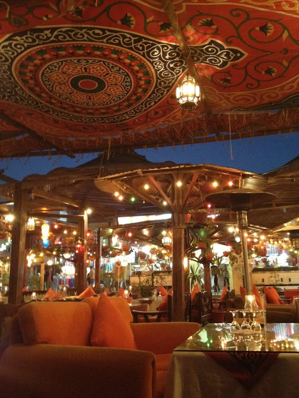 Ali Baba’s restaurant further along the beach promenade in Dahab is definitely geared to tourists but the food is good, it’s well priced and the decoration with the Bedouin style hanging cloth ceilings and lanterns is fantastic. It’s an outdoor place so you can sit on one of the carved wooden seats covered in cushions and look out over the harbour. They also give you free Egyptian dips which are fantastic as a starter when you are ordering a main course. Egyptian food is pretty good not quite as good as Lebanese which I eat in acton regularly and not quite as tasty as the food we ate in Syria but similar enough that we enjoyed it.