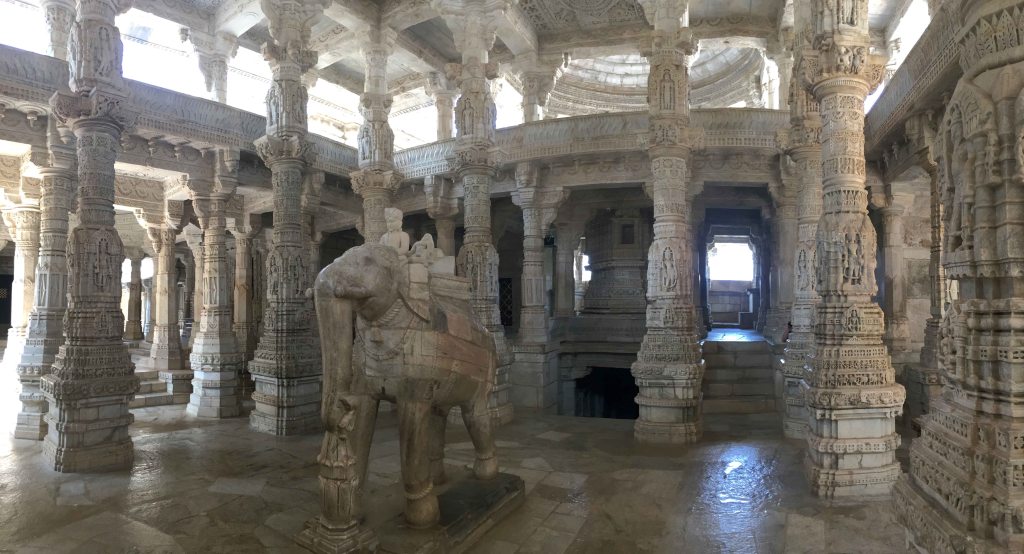 Too early for the Ranakpur Jain Temple, we drove to a local hotel and whiled away two hours drinking chai and showing Harphool photos on the iPad. Back to the temple for the 12 noon opening and paying only a 200 rupee entrance fee, our jaws hit the floor as we climbed in over the steep marble step, carved with monkey heads. 1,400 individually unique carved pillars quietly glow in the filtered sunlight; fractal like ceiling spiral above us.