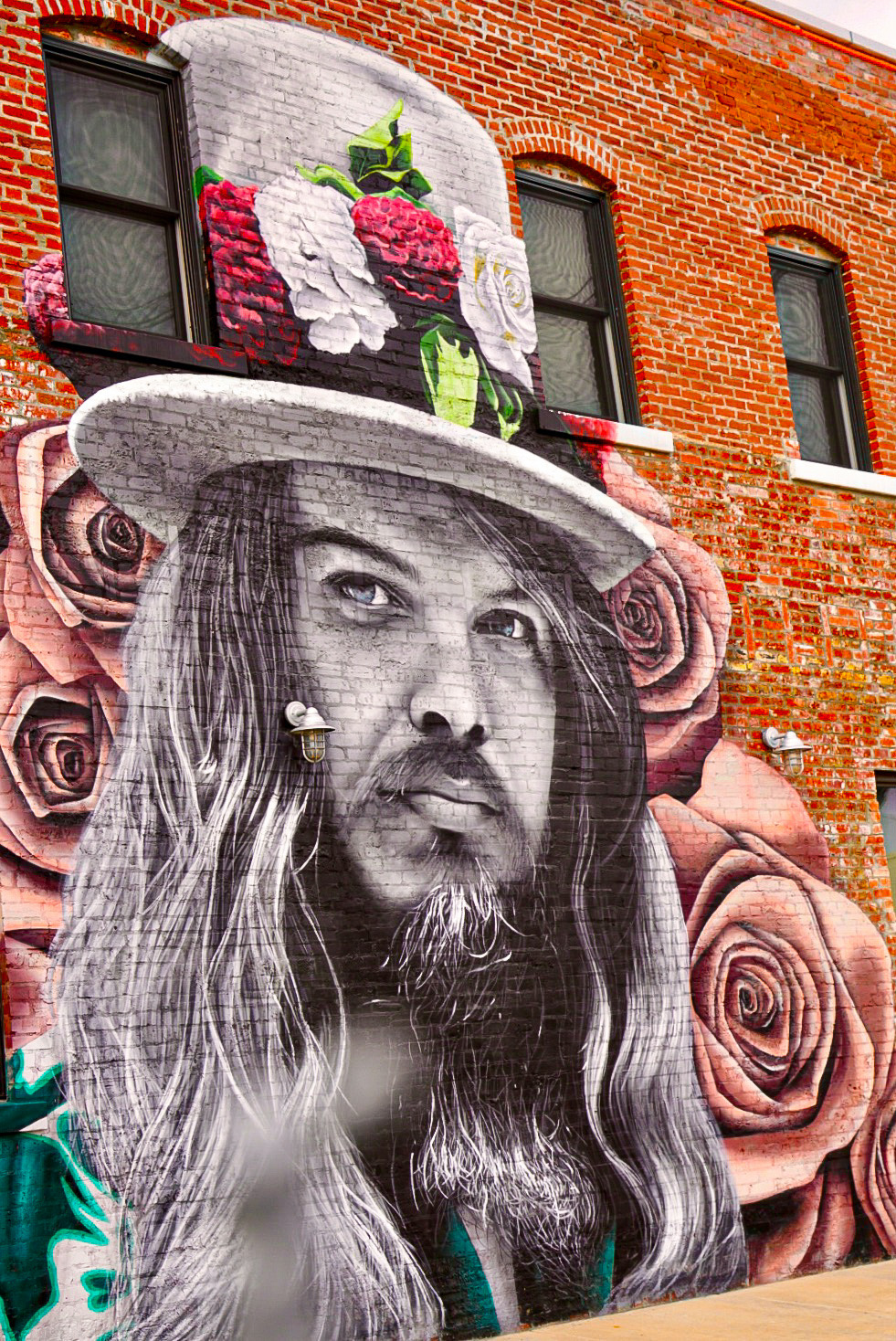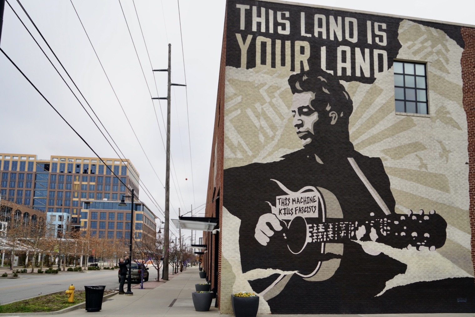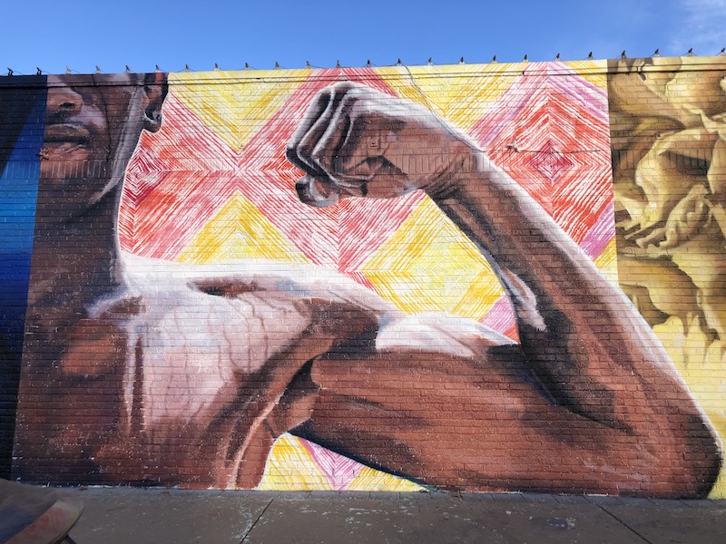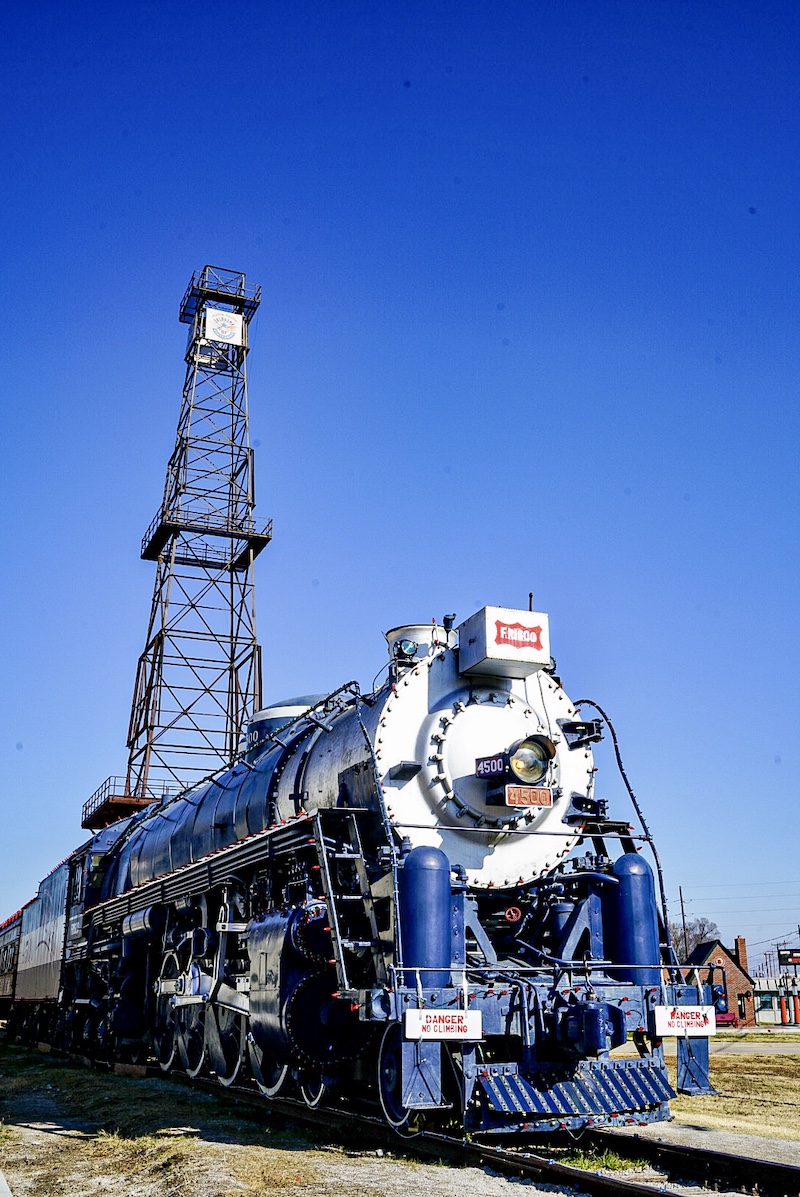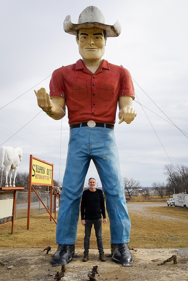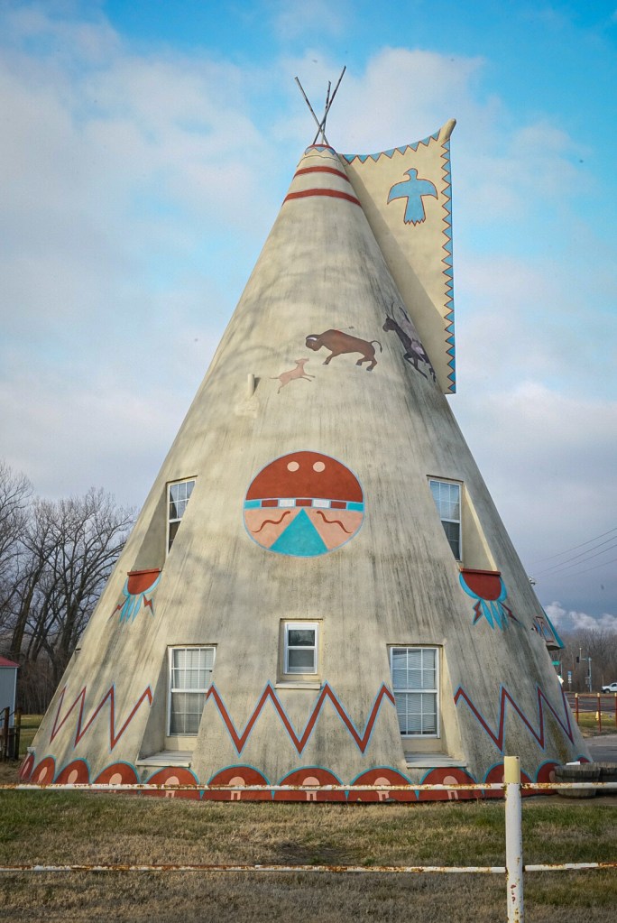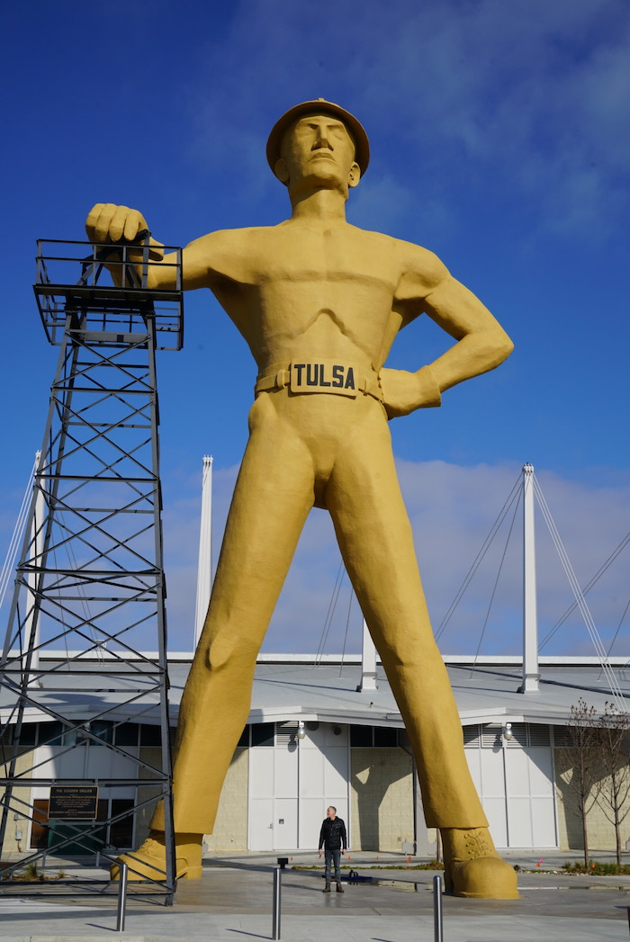 Cold start again…minus 6. We’re wearing the same clothes, layered in yesterday’s warmth. Got up early to see the Cain Ballroom and ate breakfast nearby where we met Jeff, owner of a local manufacturing company making modular buildings. A random conversation led to all sorts of discussion about America; the best way to learn about and understand a country is through its people. An interesting man living in an interesting city. Although a breeze through we got a feel for Tulsa and liked it; there’s community spirit, innovation, some great street art…we plan to come back when the Bob Dylan museum opens and to visit the Woody Guthrie museum. We drove around to see the Leon Russell murals (of which there are several) and to his Church Studio, not currently open to the public…music landmarks always a feature of our roadtrips. To the Golden Driller, looming against a bright blue sky. 76 feet tall, this version built in 1966; Tulsa once sitting on the world’s largest known ocean of oil with drilling derricks everywhere.