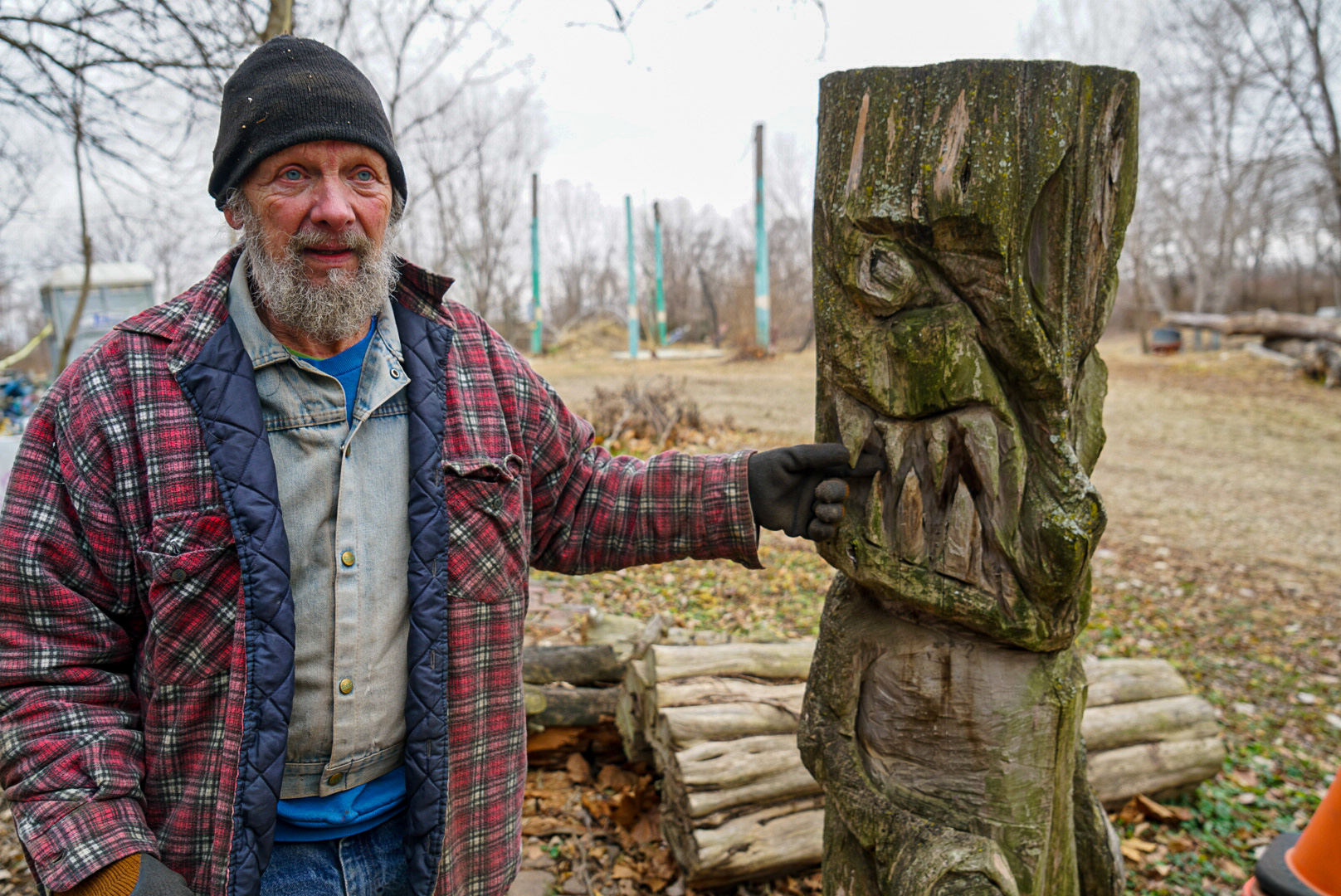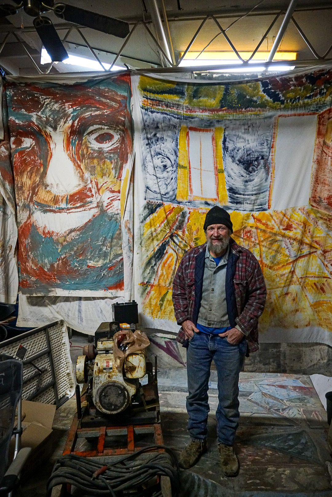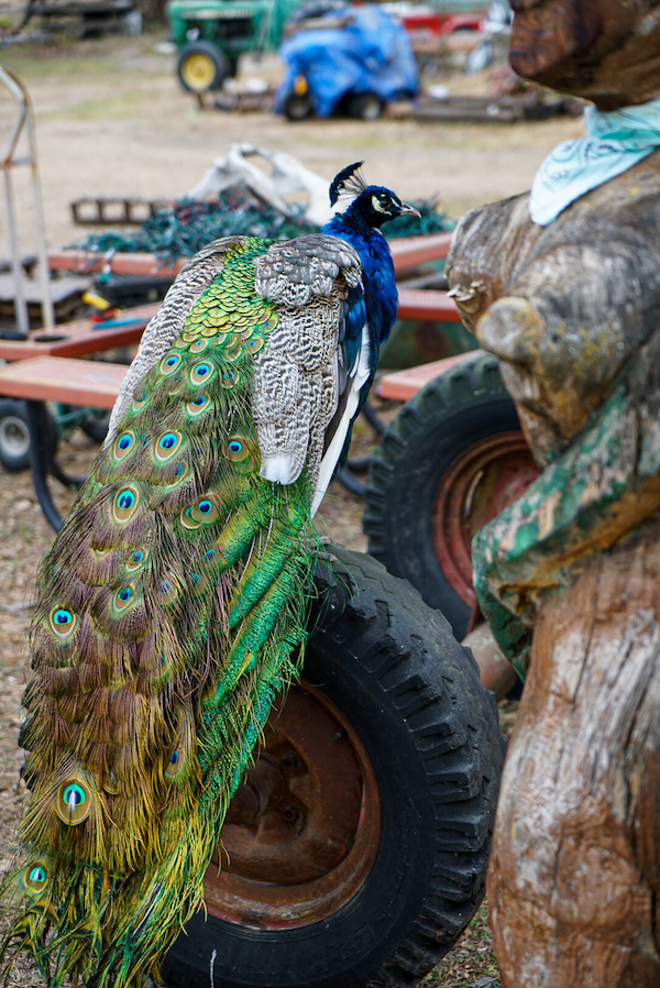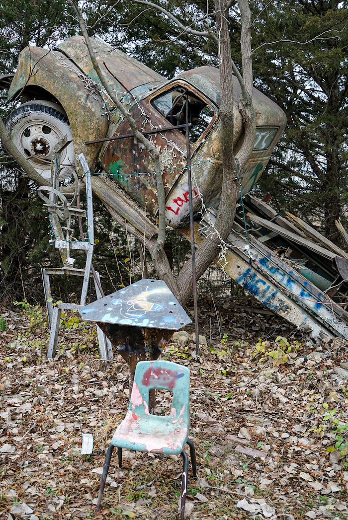 Woken by the alarm at 5.50am set by a previous guest. Breakfasted nearby, a converted Airstream indoors as the serving point for coffee and pastries. Wrapped up warm…minus 8. Driving to Topeka across agricultural land with a hard frost silvering the fields. Roadside signs berate ‘I am not a choice I’m a child’ and ‘Jesus came for you’. We stopped to look at “the world’s largest concrete teepee’. Everything in America is the world’s largest, the best in the world, the only one in the world…it’s amusing. More roadsigns ‘The Sod Shop’ (particularity amusing to Brits)…detouring to Ron and Linda’s ‘Truckhenge’. We arrive to the sound of gunfire…locals at target practice on the next door plot. Ron’s home is a Quonset hut, a blue painted concrete mixer heralds the stairs to a metal walkway accessing the first floor. Huge and open plan inside, the ceiling hung with baskets, an indoor garden and an handmade cage elevator down to Ron’s art studio where his daughter’s old bedsheets are repurposed as canvases with household paint. Ron’s a genuine outsider artist and we’re charmed by his eccentric talk and love of puns. Outside chainsaw carved tree trunks, upended trucks and graffitied boats, a shoe tree, buffalo bones dug from his lake fill boxes and old filing cabinets… installation art projects through which 4 peacocks and a rooster roam. We both love this place.