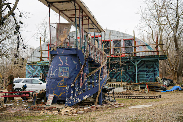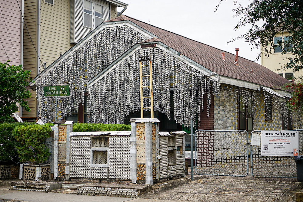 To the beer-can house festooned with beer cans, bottles, other beer can parts; created 1960s to 1980s by John Milkovisch at 222 Malone Street. Outside of Covid there are tours but I was content to look at it from the street, listening to the jangle of hanging metal hustling in the wind.