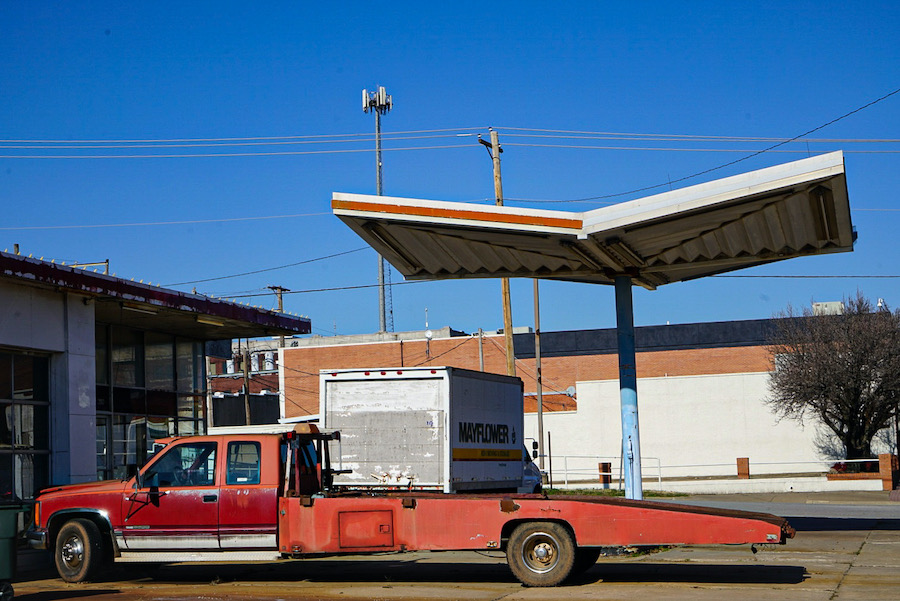 Hitting Route 66 at sundown, stopping to see a Muffler Man, a roadtrip favourite for Dave, he found them mapped on ‘Roadside America’. Buck Atom found broken discarded in a Canadian junkyard, brought to Virginia where it was rebuilt by fibreglass artist Mark Cline who made a mold of the body. Lots of work later, a collaboration with a shop owner in Tulsa who was looking for a Muffler Man style mascot for her store Cosmic Curious and with another artist creating the silver rocket, Buck Atom was born and unveiled in Spring of 2019. At over 20 feet high, Buck and the store were a fun diversion. Ate at a small Vietnamese place in Tulsa, basic canteen style but good food. Our Airbnb is an old house, deserted when we arrived, no lights on. Heavy wooden doors lead off the landing behind one of which was our room. Bibles on the tables, an old kitchen, eerie. The WiFi code ‘Sabbath’. Traffic under our window, curtains that didn’t fit; comfortable enough.