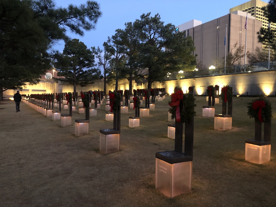 Visited the Oklahoma bombing memorial which at late dusk was an emotional pull. 168 people killed by Timothy McVeigh…their senseless deaths portrayed by 168 empty chairs made from a clear lucite material lit so they glowed softly each decorated with a Christmas wreath. Designed with such sensitivity that it feels serene. We drove around the city, every major street draped with coloured Christmas lights. We saw a slim shadow in a cowboy hat loading his truck and we struck up a conversation. A geologist, Dave recently opened a specialty rock and mineral store. Fascinating hyperactive energised by his love of geology he showed us around with infectious enthusiasm. I told him he looked like a former Hollywood stuntman…because he did.
