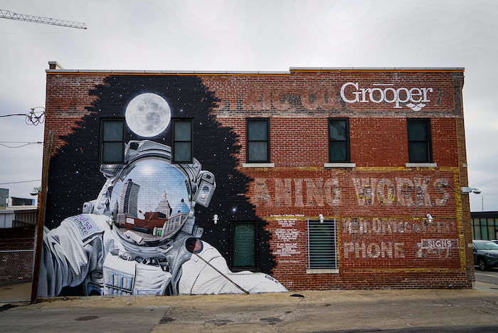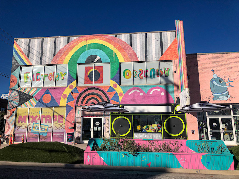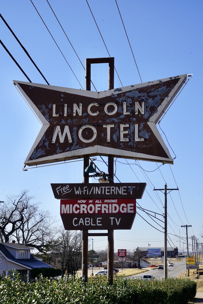 And on through Oklahoma, driving through photogenic Bristow with its brick buildings, Trump banners, trucks and gas stations. Arriving in Oklahoma City our first stop Factory Obscura Mix-Tape; an indoor sensory maze, 30 minutes crawling through tunnels, carpeted caves; bizarre hand made installations and trippy lighting…fun…kids will love it. In the Plaza district; street art murals, small boutiques, hipster influenced…not enough to hold us long but the murals were great. Ate at the Collective food market but it’s mainly burgers, pizza or fried food. At $4.25 a slice the pizza more expensive than New York. Checked in to the motel which looked great but paper thin walls, traffic noise and guests banging in and out, shoes ringing on the metal staircase, useless heating on a frigid night; bang goes the dream of roadtripping on a motel budget. We discovered that we and the room next door were the only guests…but they put us in rooms next to each other.