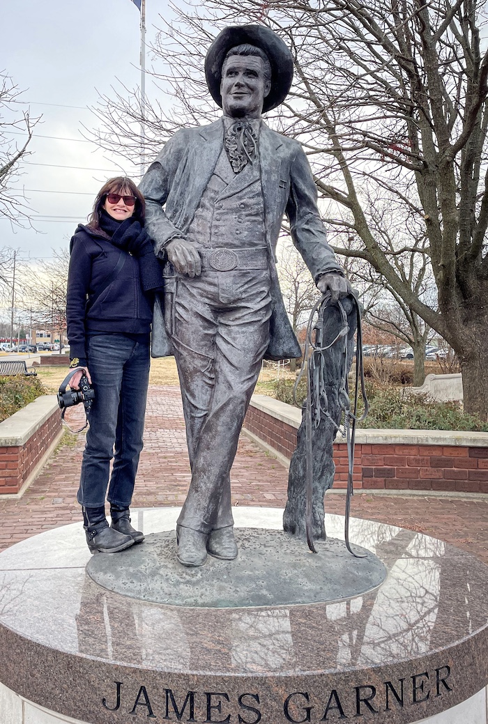Out of the noisy motel early and to breakfast at ‘Neighborhood Jam’ in Midtown Oklahoma city where we met Calvin our waiter, who was interested in where we were from and where we were going. Treating me to a free biscuit because I wasn’t sure what it was….more like a salty English scone, a biscuit to us is a cookie in America. Leaving the city we drove through cold frozen landscapes to the small town of Norman, en-route to where we were eventually heading but a quirky stop to see the James Garner statue, dressed as his role in Maverick rather than childhoood favourite ‘The Rockford Files’. I stood on the train tracks, cold…frosty, a white light early morning. Local police idled by waving at us. We drove on looking for a VW Beetle turned in to a giant spider, allegedly slowly sinking…couldn’t find it, must’ve sunk.