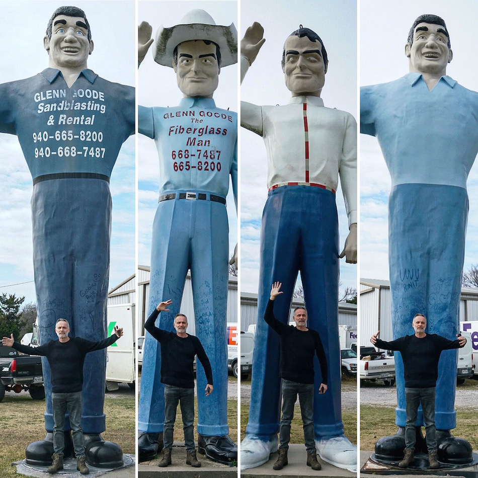 Next stop Magnetic Hill on Pit Road in Springer… a slight gradient between fields where we tested the claim that this ‘gravity hill’ has a magnetic pull which will drag your car backwards when in neutral. It did, and accelerated…we tested it several times, laughing and exclaiming. It’s surreal but scientifically the layout of the surrounding land and landmarks creates an optical illusion making a slight downhill slope appear to be an uphill slope…but let’s just choose to believe there’s a magnetic force in the ground. We drive on, by ‘Fuku Japanese Grill’, ‘Snowflake Donuts’…over the State border to Gainesville Texas to see 4 Muffler Men and a woman…sadly my photo of the woman didn’t come out…the sisterhood will cancel me.