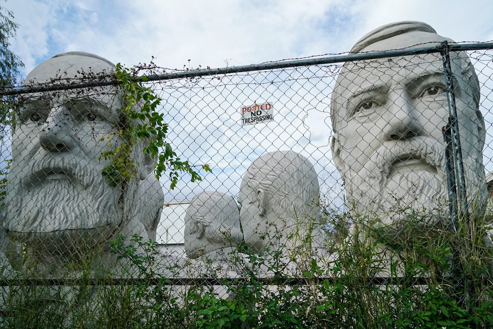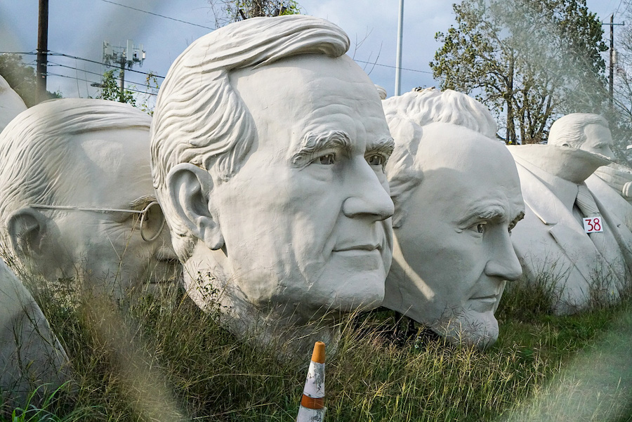 A short drive to see more of sculptor David Adickes…a series of giant President heads once the attraction at theme parks in South Dakota and Virginia (both now closed), lined up tangled in weeds and wildflowers on his studio lot behind high chain-link fences. Closed to the public but gazing ominously across the lot and easily seen.