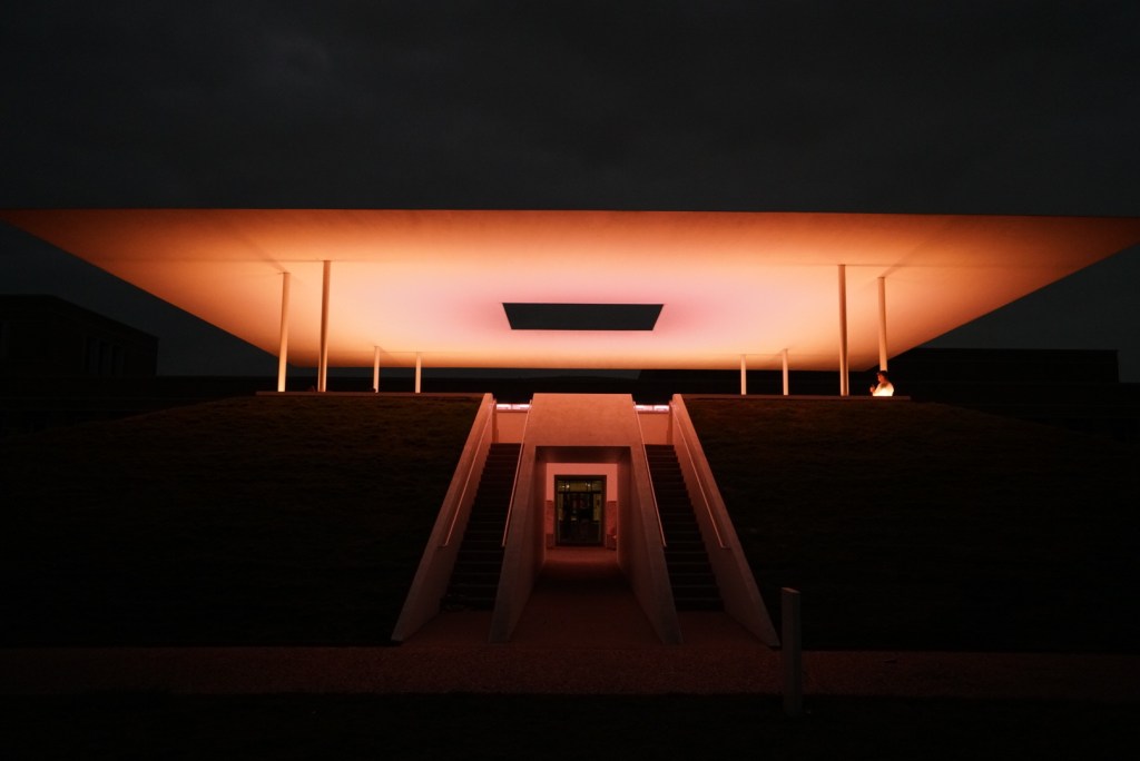 Ending the day at artist James Turrell ‘Twilight Epiphany Skyspace’ on the Rice University Campus, timing our visit with sunset to watch LED coloured light projections on to the 72 foot square knife-edge roof with a central opening to the sky. We sat on marble seats on the ground floor in the middle of the structure looking up whilst others were seated above us surrounding the edge on narrow benches. It looked better from a distance, like a spacecraft landed on the manicured lawns, its colours turning from yellow, orange, grey, green and blue.